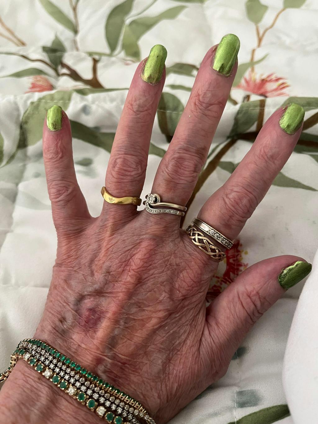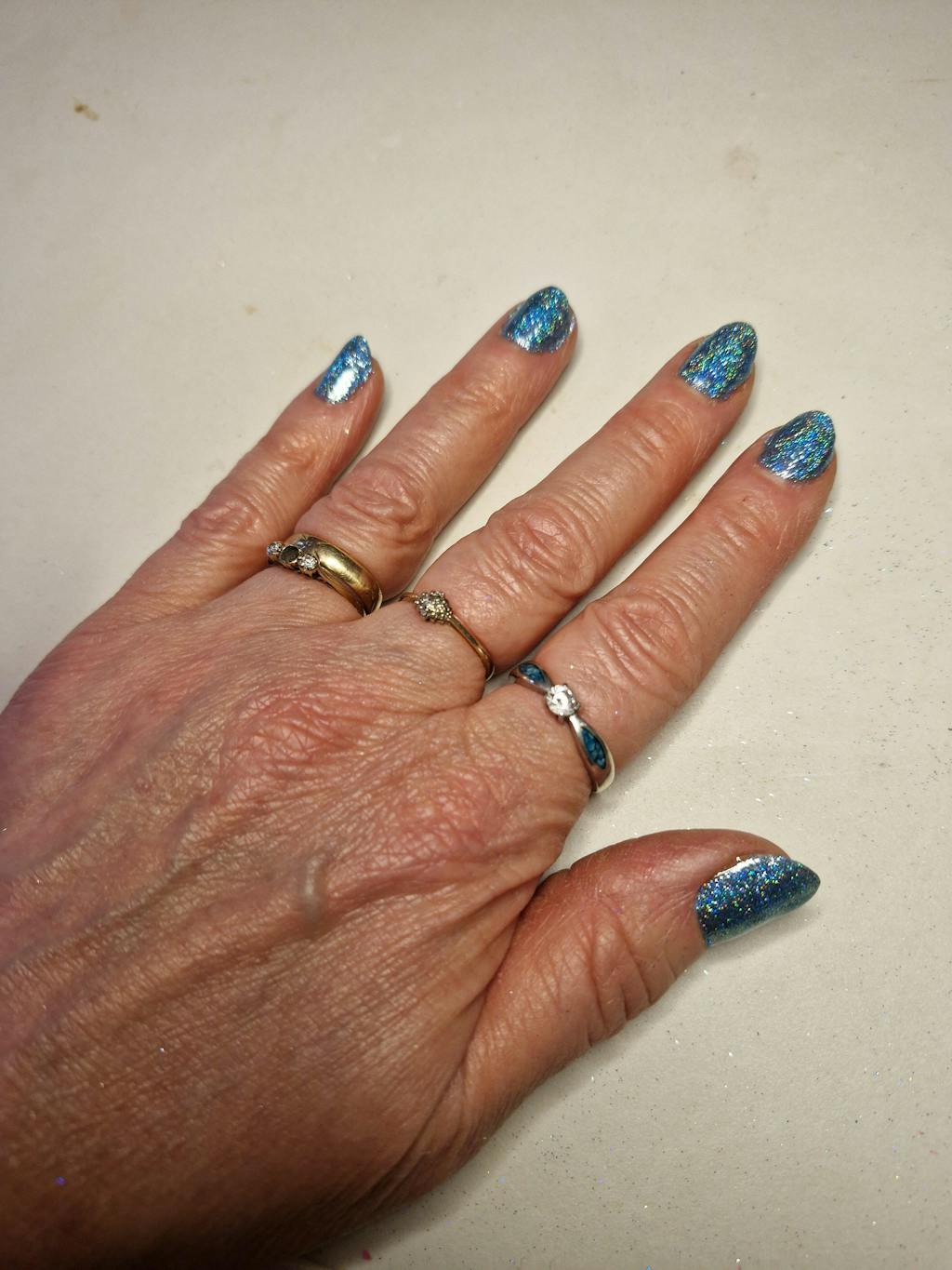 I absolutely love this shade, it's a wonderfully sparkling mix of green, gold and purple - I got countless compliments on it! I always apply two coats and here is a result on the pictures. Go get it!