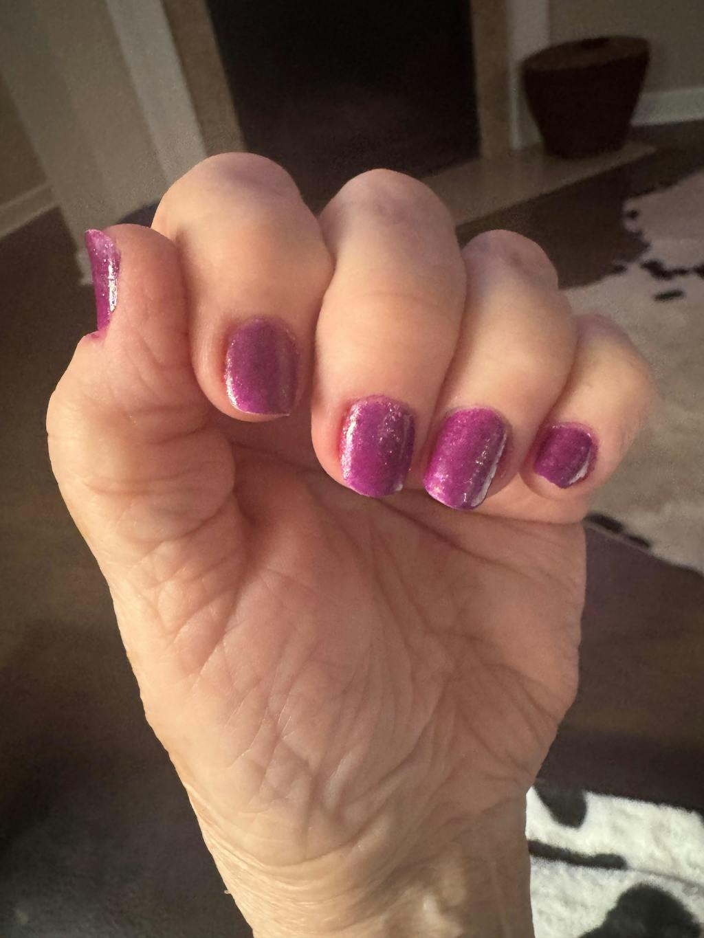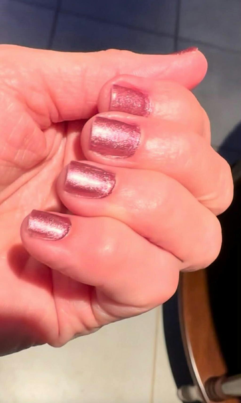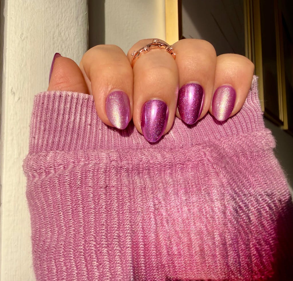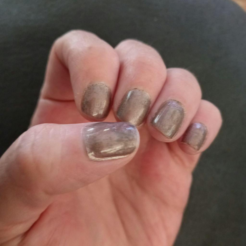 This color is beautiful! It can be purple if applies over a cured base coat or pinkish if applied over a cured top coat. This is applied over a cured base coat.